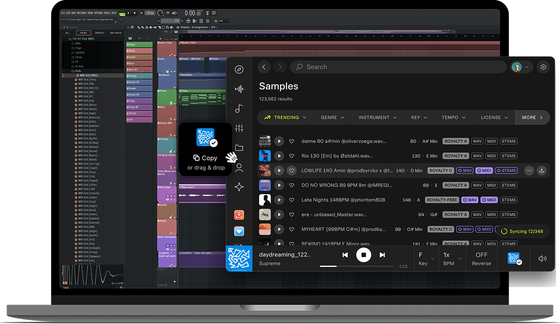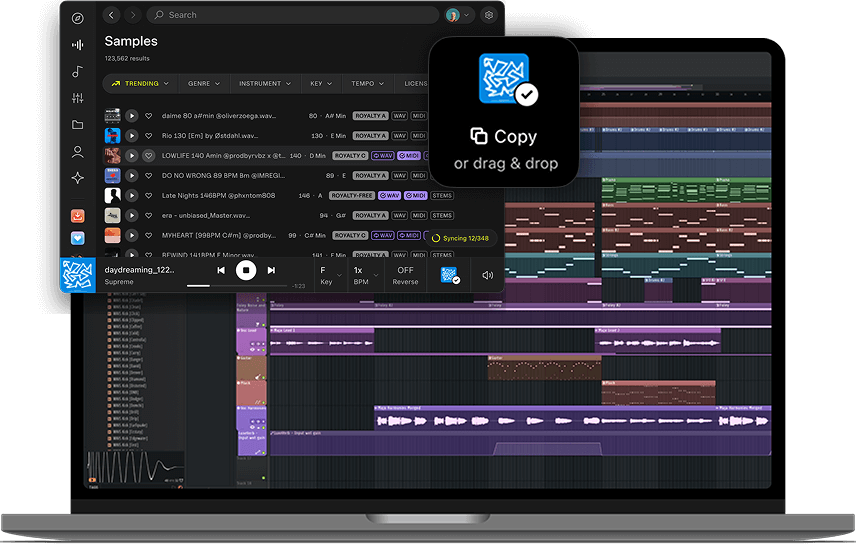 Search, play and download directly from your DAW with real-time key and tempo syncing. No more toggling between apps—our VST plugin lets you stay focused.